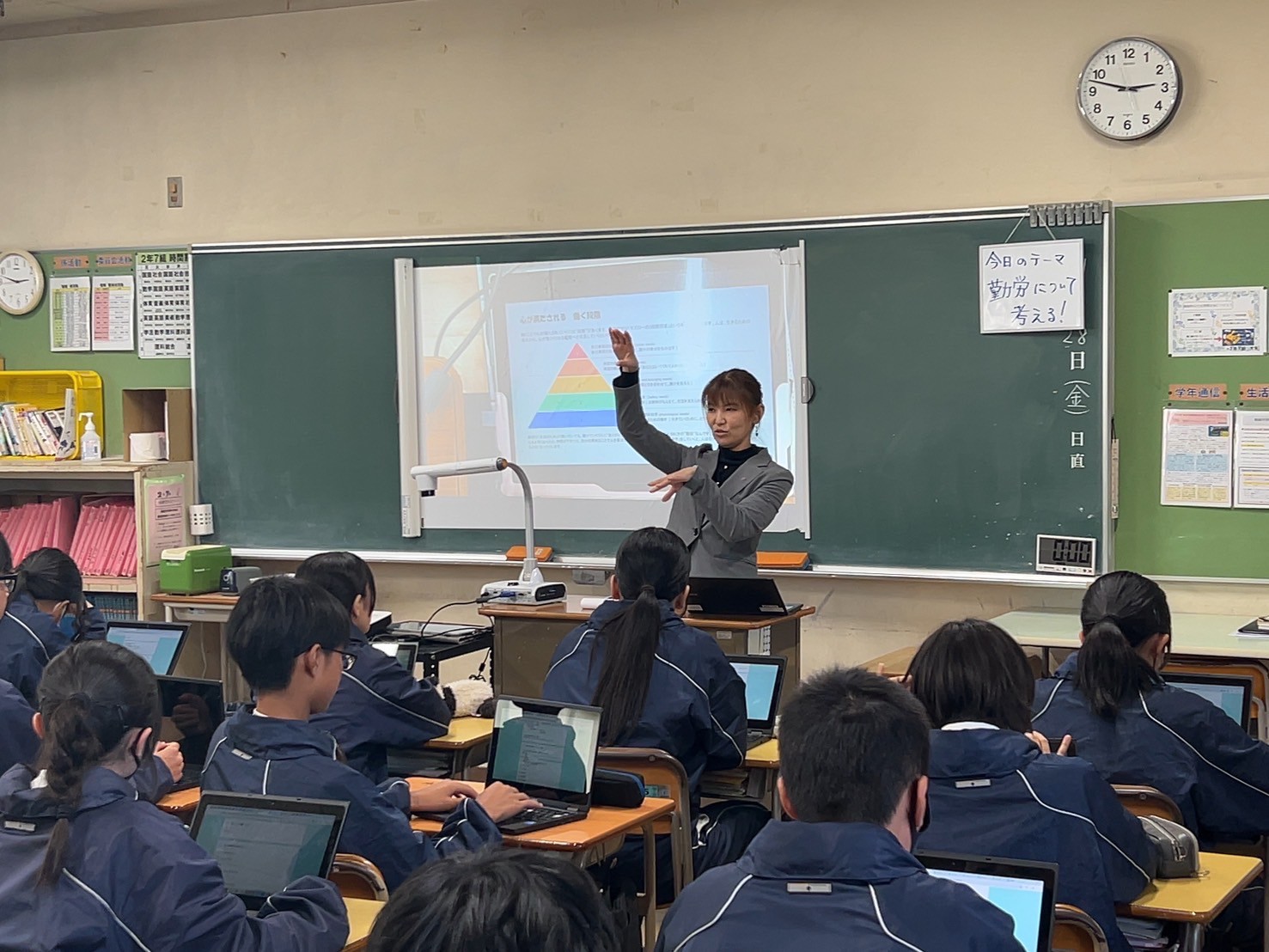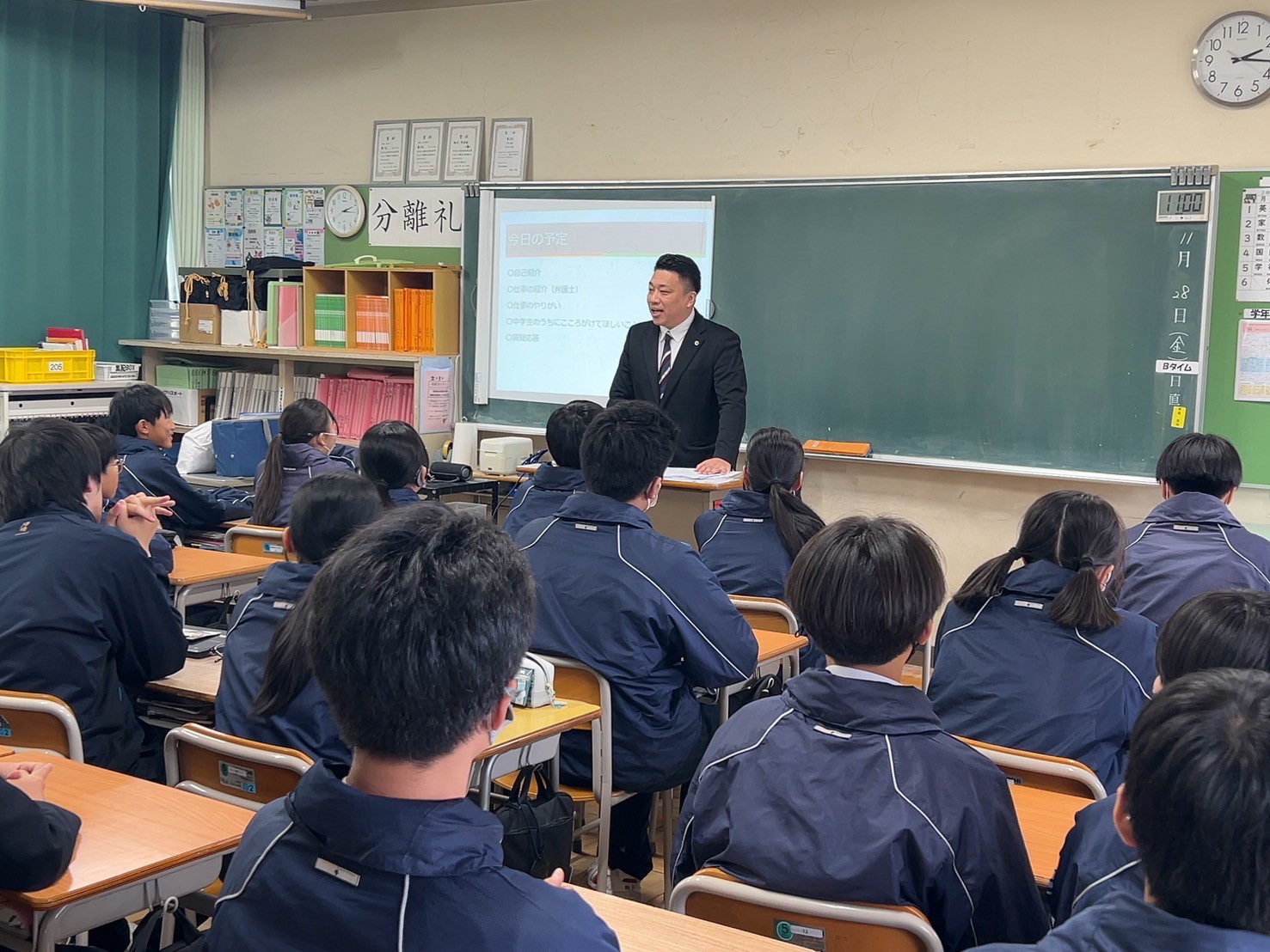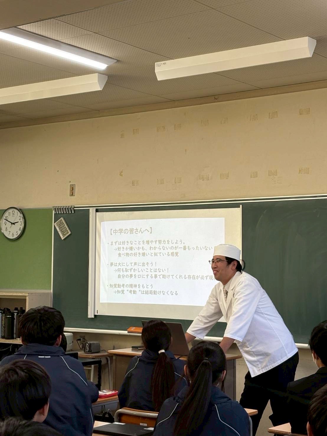 今回は道徳の授業を生徒と一緒にうけ、その後に職業講話会という初のこころみでした。